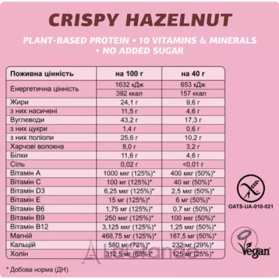 Без добавленного сахара. Батончики содержат до 1 г сахара. Без глютена, ГМО и пальмового масла. Это идеальная опция для следящих за здоровьем или имеющих определенный вид диеты. В составе – растительный протеин, высокое содержание клетчатки и порция витаминов, что делает перекус универсальным для всех!