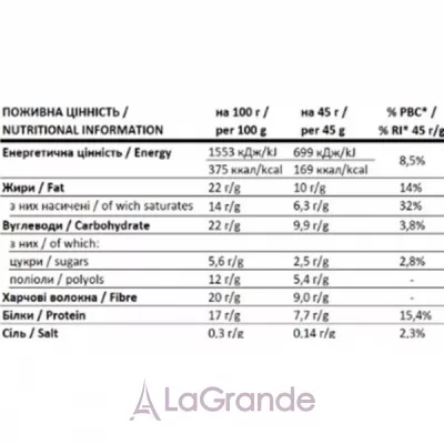 молочний шоколад 29 % (масло какао, харчові волокна – полідекстроза, сиворотка молочна суха, підсластителі (мальтит, стевіол глікозиди зі стевії), молоко сухе знежирене, какао-порошок, емульгатор – соєвий лецитин, натуральний ваннийконцентрат сивороточного білка [молоко], концентрат молочного білка), карамель з підсластителями 8,6 % (пищові волокна – ізомальтоолігосахарид, підсластителі (сорбіт, мальтит), влагоудерживающий агент – гліцерин, молоко сухознежирене, кокосоважирна кислота, натуральний ароматизатор), харчові волокна – ізомальтоолігосахарид, кокосове масло, вологовмісні речовини (гліцерин, сорбітол), грецькі орехи 4%, ізюм, хрусткі шарики 3,5% (рисова крупа, соль), арахіс, натуральні моно- і дигліцериди жирних кислот, антиоксиданти – вітамін Е (токоферол), регулятор кислотності – лимонна кислота.